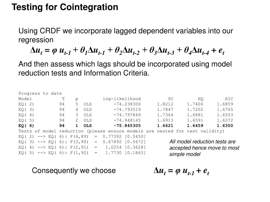 Testing for Cointegration • Using CRDF we incorporate lagged dependent variables into our regression • Δut = φ ut-1 + θ1Δut-1 + θ2Δut-2 + θ3Δut-3 + θ4Δut-4 + et • And then assess which lags should be incorporated using model reduction tests and Information Criteria. • Progress to date • Model T p log-likelihood SC HQ AIC • EQ( 2) 94 5 OLS -74.238306 1.8212 1.7406 1.6859 • EQ( 3) 94 4 OLS -74.793519 1.7847 1.7202 1.6765 • EQ( 4) 94 3 OLS -74.797849 1.7364 1.6881 1.6553 • EQ( 5) 94 2 OLS -74.948145 1.6913 1.6591 1.6372 • EQ( 6) 94 1 OLS -75.845305 1.6621 1.6459 1.6350 • Tests of model reduction (please ensure models are nested for test validity) • EQ( 2) --> EQ( 6): F(4,89) = 0.77392 [0.5450] • EQ( 3) --> EQ( 6): F(3,90) = 0.67892 [0.5672] • EQ( 4) --> EQ( 6): F(2,91) = 1.0254 [0.3628] • EQ( 5) --> EQ( 6): F(1,92) = 1.7730 [0.1863] • Consequently we choose Δut = φ ut-1 + et All model reduction tests are accepted hence move to most simple model