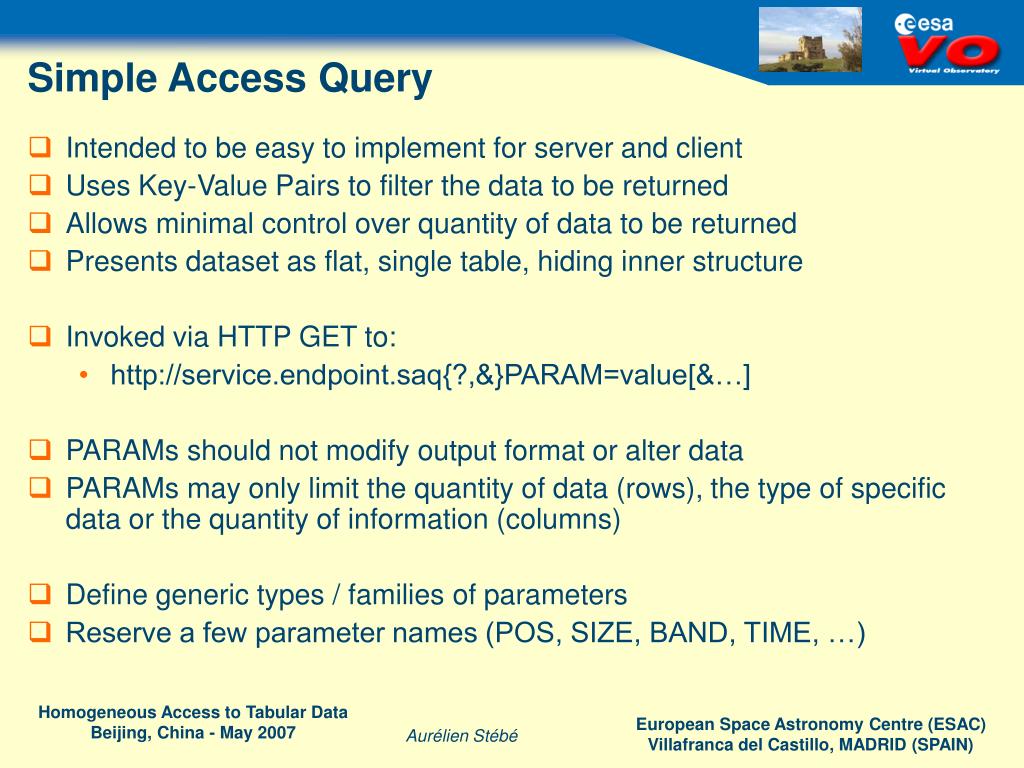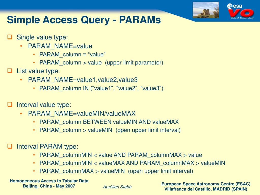 Simple Access Query - PARAMs • Single value type: • PARAM_NAME=value • PARAM_column = “value” • PARAM_column > value (upper limit parameter) • List value type: • PARAM_NAME=value1,value2,value3 • PARAM_column IN (“value1”, “value2”, “value3”) • Interval value type: • PARAM_NAME=valueMIN/valueMAX • PARAM_column BETWEEN valueMIN AND valueMAX • PARAM_column > valueMIN (open upper limit interval) • Interval PARAM type: • PARAM_columnMIN < value AND PARAM_columnMAX > value • PARAM_columnMIN < valueMAX AND PARAM_columnMAX > valueMIN • PARAM_columnMAX > valueMIN (open upper limit interval)