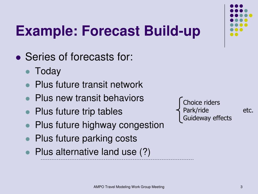 Why Bother? A new way of thinking about forecasting Insights, not just model mechanics Range of possible outcomes Another approach for quality control checks Information for decision makers Upper/lower bound, most likely Honesty in presentation of forecasts Predicted-versus-actual outcomes AMPO Travel Modeling Work Group Meeting 2