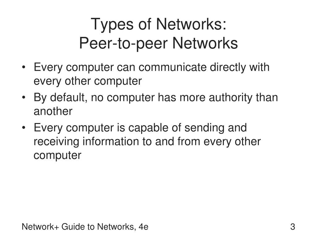 Types of Networks: Peer-to-peer Networks • Every computer can communicate directly with every other computer • By default, no computer has more authority than another • Every computer is capable of sending and receiving information to and from every other computer Network+ Guide to Networks, 4e