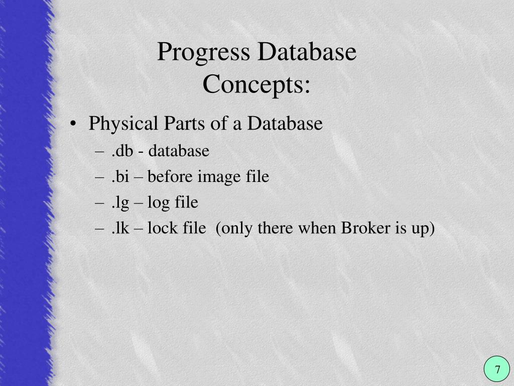 Progress Database Concepts: • Physical Parts of a Database • .db - database • .bi – before image file • .lg – log file • .lk – lock file (only there when Broker is up) 7