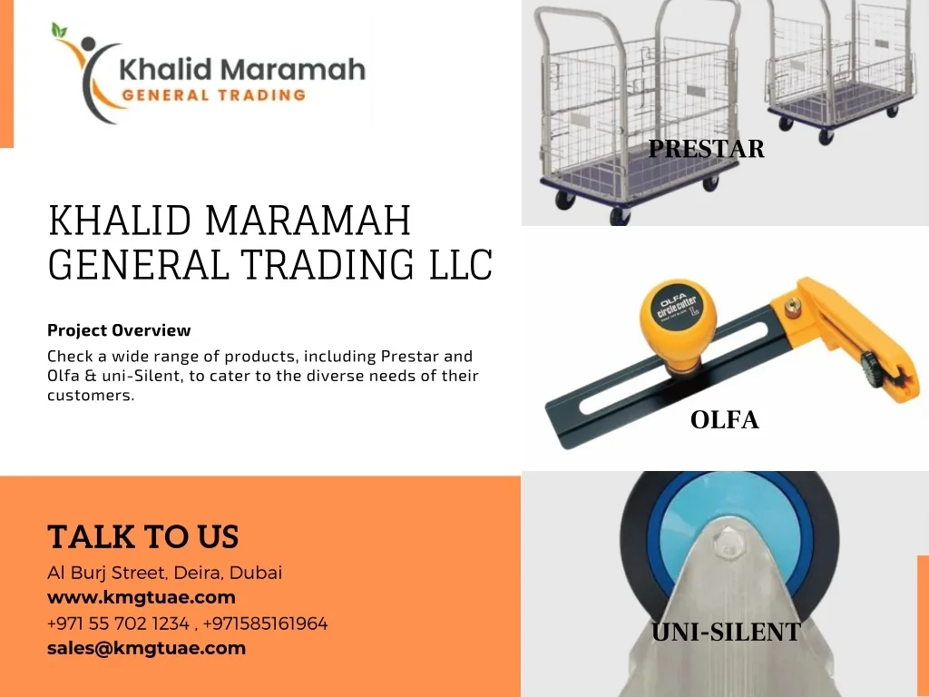 PRESTAR KHALID MARAMAH GENERAL TRADING LLC Project Overview Check a wide range of products, including Prestar and Olfa & uni-Silent, to cater to the diverse needs of their customers. OLFA TALK TO US Al Burj Street, Deira, Dubai www.kmgtuae.com +971 55 702 1234 , +971585161964 sales@kmgtuae.com UNI-SILENT