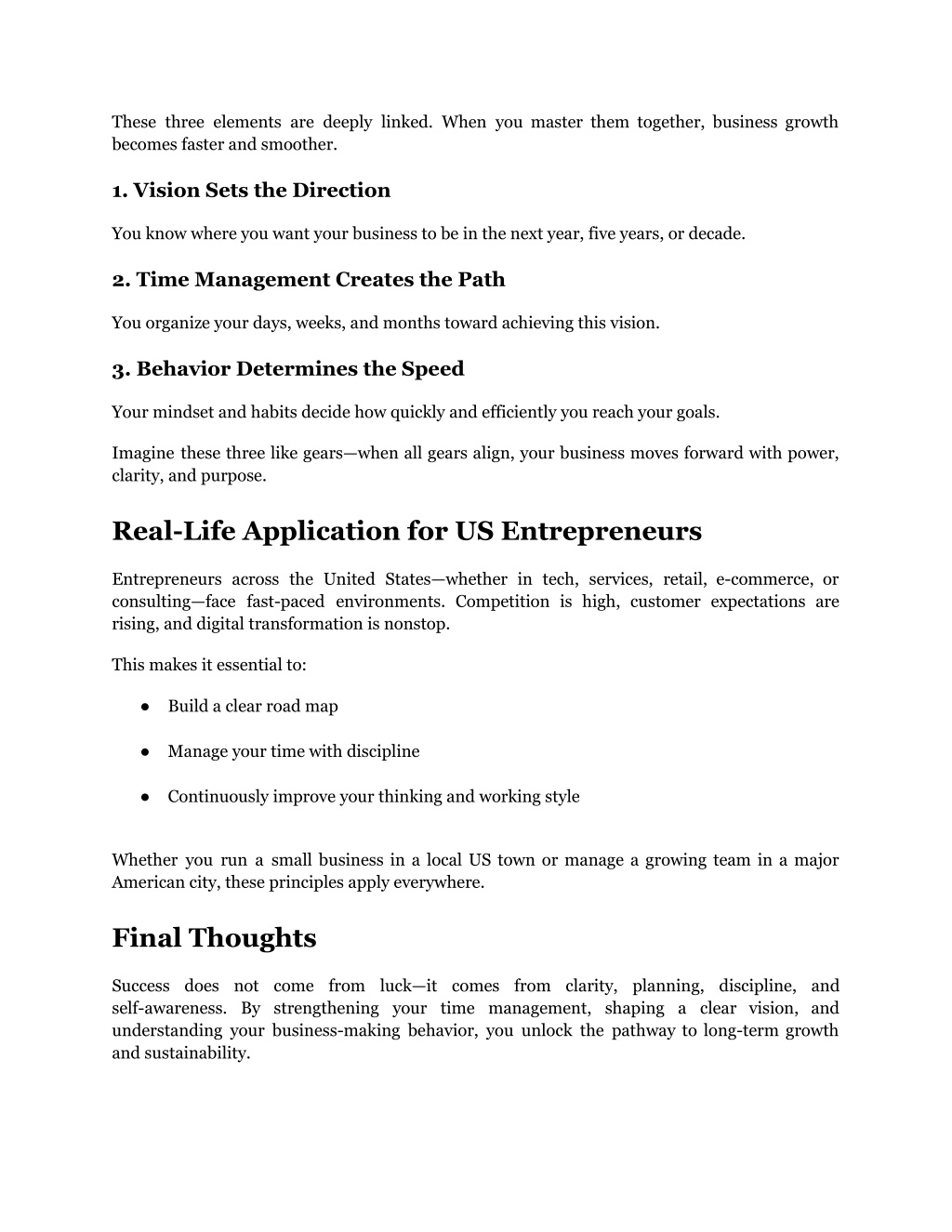 4. These three elements are deeply linked. When you master them together, business growth becomes faster and smoother. 1. Vision Sets the Direction You know where you want your business to be in the next year, five years, or decade. 2. Time Management Creates the Path You organize your days, weeks, and months toward achieving this vision. 3. Behavior Determines the Speed Your mindset and habits decide how quickly and efficiently you reach your goals. Imagine these three like gears—when all gears align, your business moves forward with power, clarity, and purpose. Real-Life Application for US Entrepreneurs Entrepreneurs across the United States—whether in tech, services, retail, e-commerce, or consulting—face fast-paced environments. Competition is high, customer expectations are rising, and digital transformation is nonstop. This makes it essential to: ● Build a clear road map ● Manage your time with discipline ● Continuously improve your thinking and working style Whether you run a small business in a local US town or manage a growing team in a major American city, these principles apply everywhere. Final Thoughts Success does not come from luck—it comes from clarity, planning, discipline, and self-awareness. By strengthening your time management, shaping a clear vision, and understanding your business-making behavior, you unlock the pathway to long-term growth and sustainability.