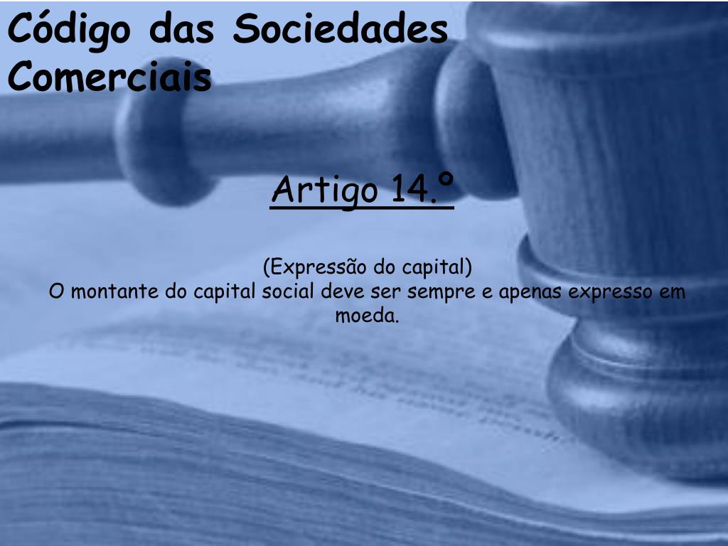 Código das Sociedades Comerciais Artigo 14.º(Expressão do capital) O montante do capital social deve ser sempre e apenas expresso em moeda.