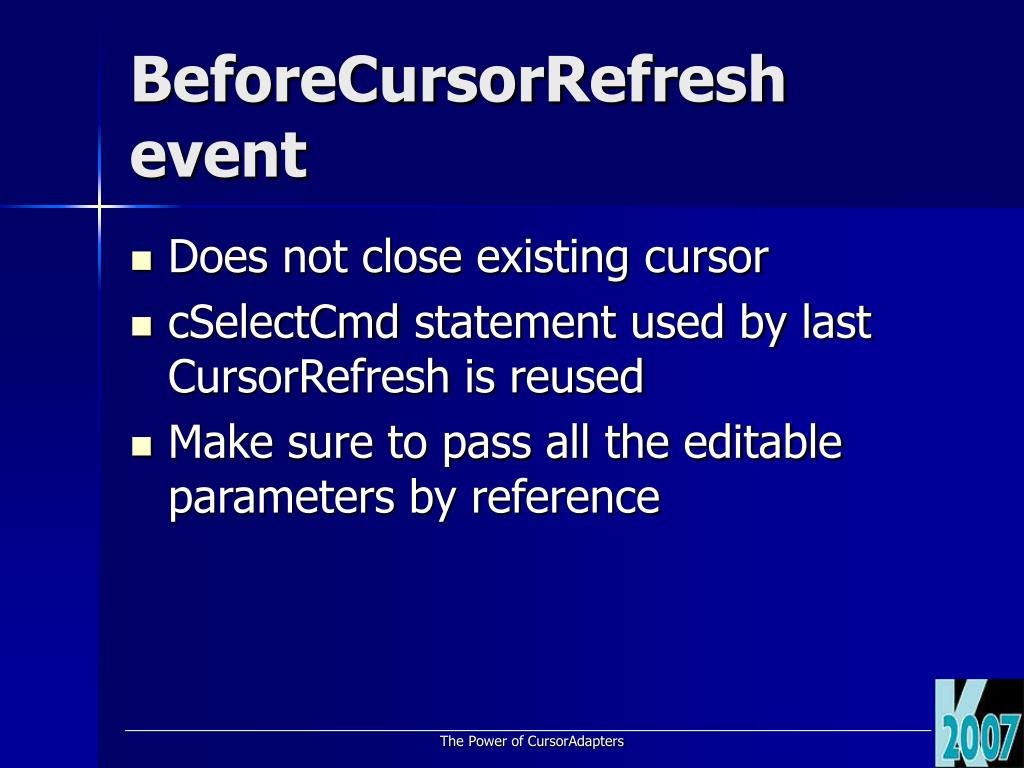 BeforeCursorRefresh event • Does not close existing cursor • cSelectCmd statement used by last CursorRefresh is reused • Make sure to pass all the editable parameters by reference The Power of CursorAdapters