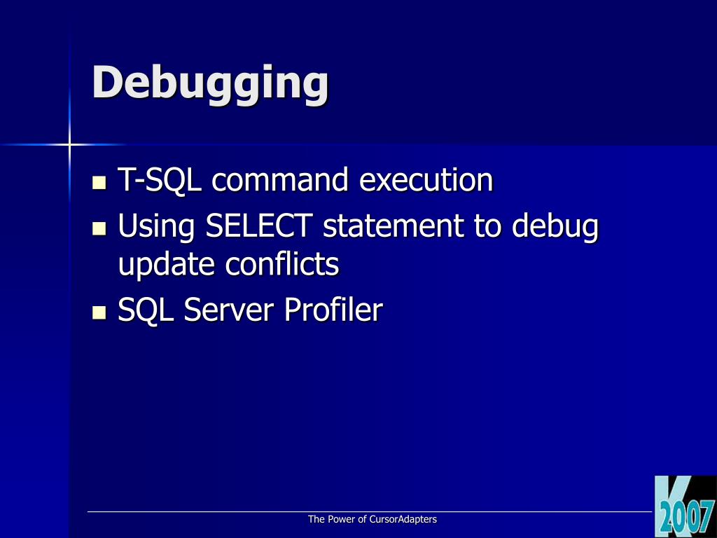 Debugging • T-SQL commandexecution • Using SELECT statement to debug update conflicts • SQL Server Profiler The Power of CursorAdapters