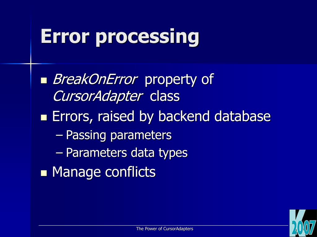 Error processing • BreakOnError property of CursorAdapter class • Errors, raised by backend database • Passing parameters • Parameters data types • Manage conflicts The Power of CursorAdapters