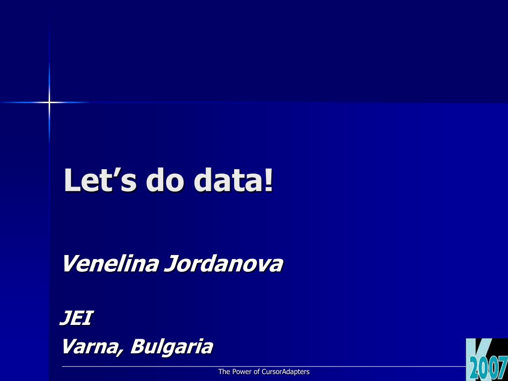 Who am I ? • Master degree in CS from TU of Varna • MCP • FoxPro developer since v 2.0 • Developer of wide range information systems • Speaker at Frankfurt DevCon 2003, 2004, 2005 and 2006, Prague 2004, 2005, 2006 and 2007, Utrecht 2006, Paris 2006 and Microsoft DevDays - Bulgaria • Owner of JEI - Varna, Bulgaria Outsourcing center Venelina@OutsourcingITservices.net The Power of CursorAdapters
