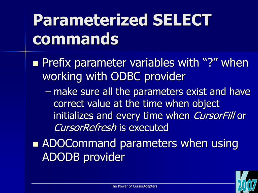 Parameterized SELECT commands • Prefix parameter variables with “?” when working with ODBC provider • make sure all the parameters exist and have correct value at the time when object initializes and every time when CursorFill or CursorRefresh is executed • ADOCommand parameters when using ADODB provider The Power of CursorAdapters