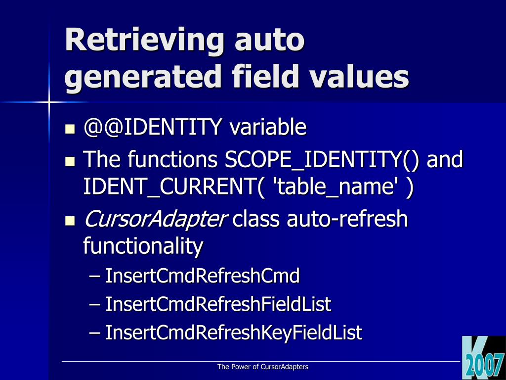 Retrieving auto generated field values • @@IDENTITY variable • The functions SCOPE_IDENTITY() and IDENT_CURRENT( 'table_name' ) • CursorAdapter class auto-refresh functionality • InsertCmdRefreshCmd • InsertCmdRefreshFieldList • InsertCmdRefreshKeyFieldList The Power of CursorAdapters
