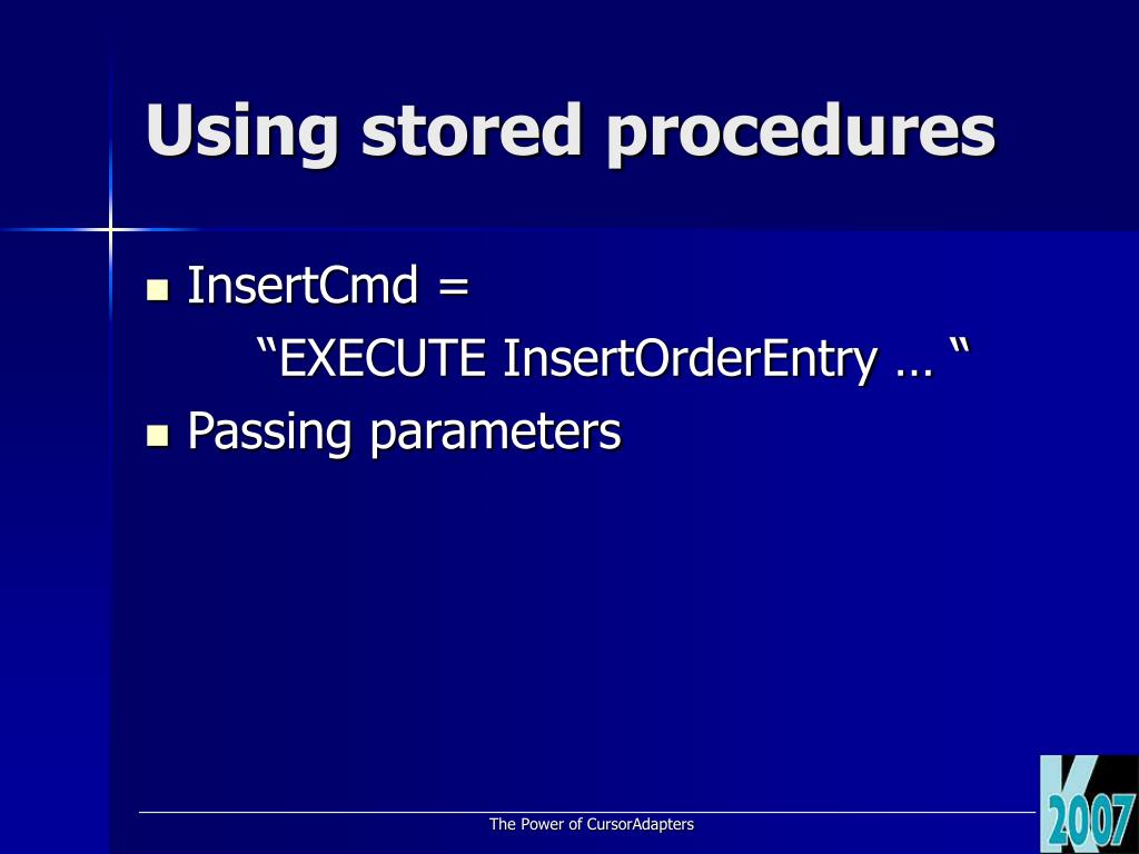Using stored procedures • InsertCmd = “EXECUTE InsertOrderEntry … “ • Passing parameters The Power of CursorAdapters