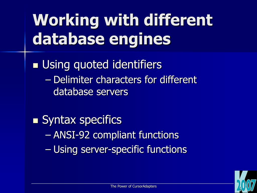 Working with different database engines • Using quoted identifiers • Delimiter characters for different database servers • Syntax specifics • ANSI-92 compliant functions • Using server-specific functions The Power of CursorAdapters