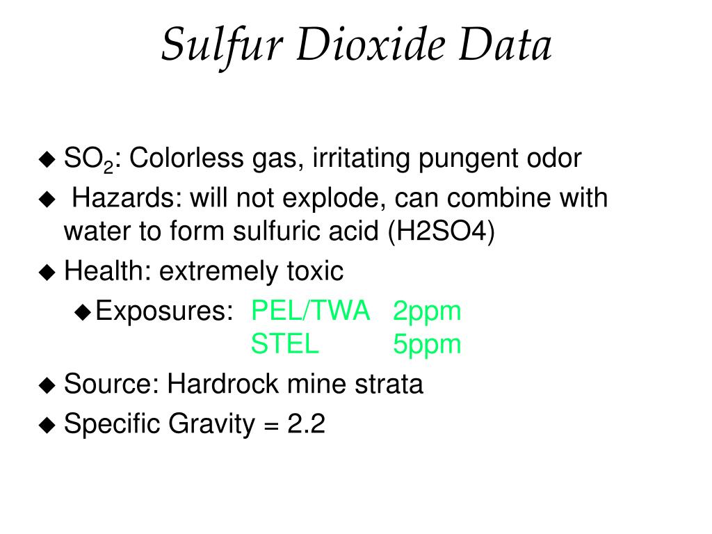 Sulfur Dioxide Data • SO2: Colorless gas, irritating pungent odor • Hazards: will not explode, can combine with water to form sulfuric acid (H2SO4) • Health: extremely toxic • Exposures: PEL/TWA 2ppm STEL 5ppm • Source: Hardrock mine strata • Specific Gravity = 2.2