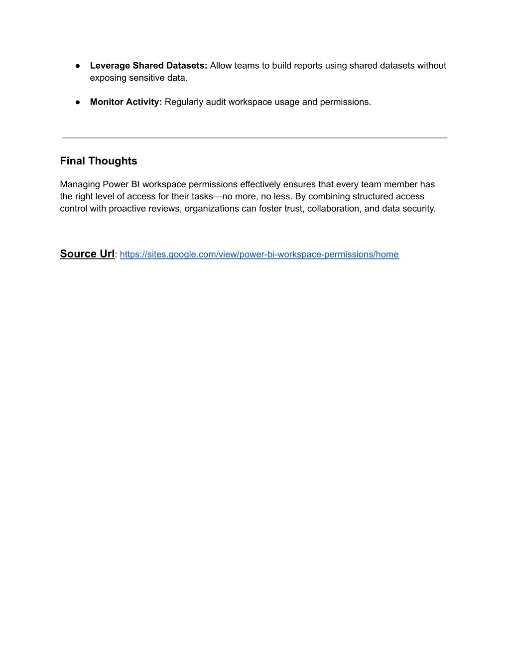 ● Leverage Shared Datasets: Allow teams to build reports using shared datasets without exposing sensitive data. ● Monitor Activity: Regularly audit workspace usage and permissions. Final Thoughts Managing Power BI workspace permissions effectively ensures that every team member has the right level of access for their tasks—no more, no less. By combining structured access control with proactive reviews, organizations can foster trust, collaboration, and data security. Source Url: https://sites.google.com/view/power-bi-workspace-permissions/home