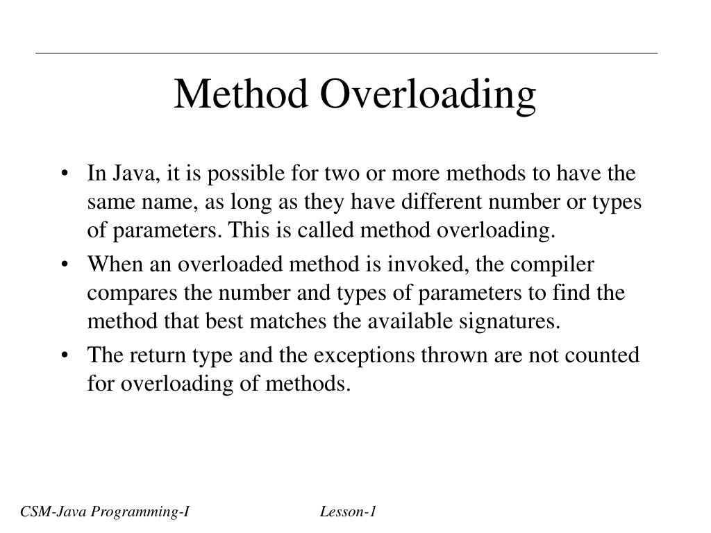 Method Overloading • In Java, it is possible for two or more methods to have the same name, as long as they have different number or types of parameters. This is called method overloading. • When an overloaded method is invoked, the compiler compares the number and types of parameters to find the method that best matches the available signatures. • The return type and the exceptions thrown are not counted for overloading of methods. CSM-Java Programming-I Lesson-1