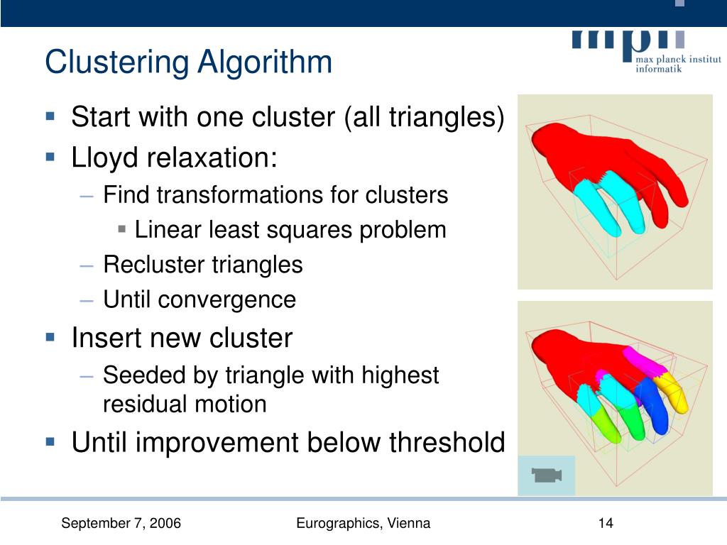 Clustering Algorithm • Start with one cluster (all triangles) • Lloyd relaxation: • Find transformations for clusters • Linear least squares problem • Recluster triangles • Until convergence • Insert new cluster • Seeded by triangle with highest residual motion • Until improvement below threshold Eurographics, Vienna