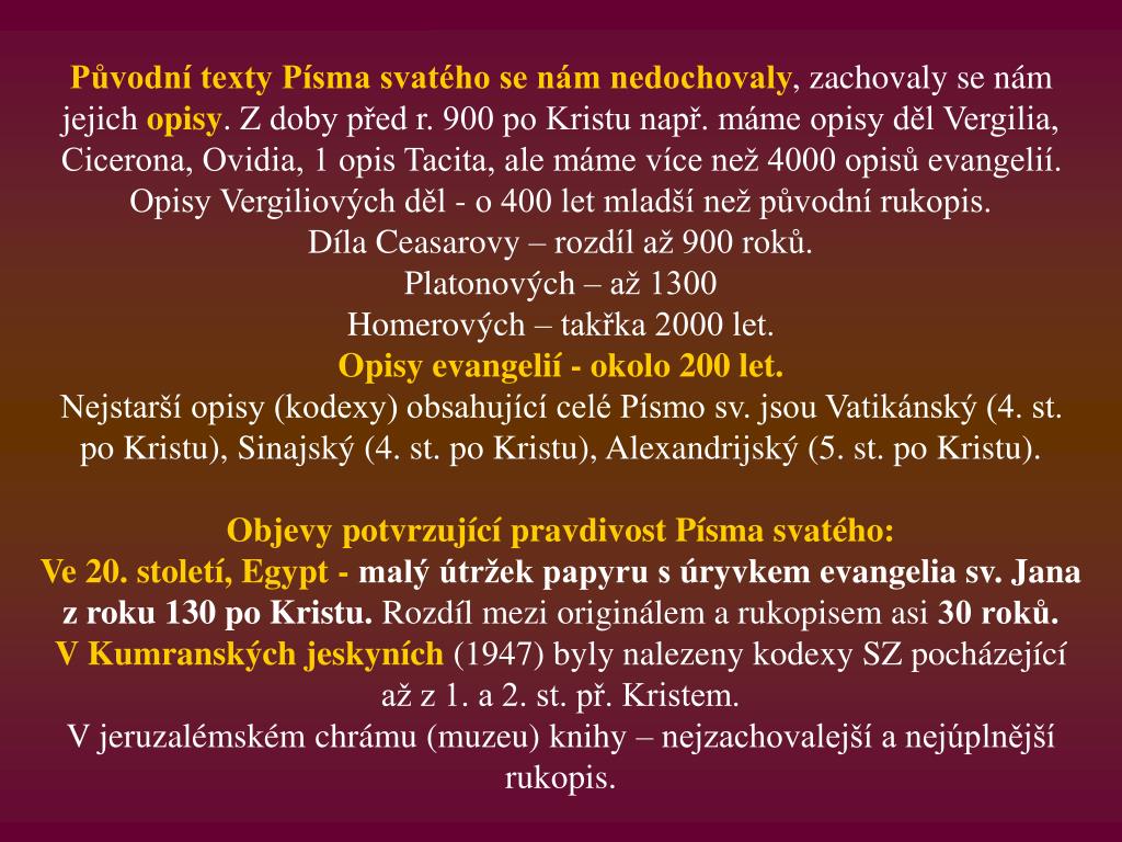 Původní texty Písma svatého se nám nedochovaly, zachovaly se nám jejich opisy. Z doby před r. 900 po Kristu např. máme opisy děl Vergilia, Cicerona, Ovidia, 1 opis Tacita, ale máme více než 4000 opisů evangelií.Opisy Vergiliových děl - o 400 let mladší než původní rukopis. Díla Ceasarovy – rozdíl až 900 roků. Platonových – až 1300 Homerových – takřka 2000 let.Opisy evangelií - okolo 200 let.Nejstarší opisy (kodexy) obsahující celé Písmo sv. jsou Vatikánský (4. st. po Kristu), Sinajský (4. st. po Kristu), Alexandrijský (5. st. po Kristu). Objevy potvrzující pravdivost Písma svatého:Ve 20. století, Egypt - malý útržek papyru s úryvkem evangelia sv. Jana z roku 130 po Kristu. Rozdíl mezi originálem a rukopisem asi 30 roků.V Kumranských jeskyních (1947) byly nalezeny kodexy SZ pocházející až z 1. a 2. st. př. Kristem.V jeruzalémském chrámu (muzeu) knihy – nejzachovalejší a nejúplnější rukopis.