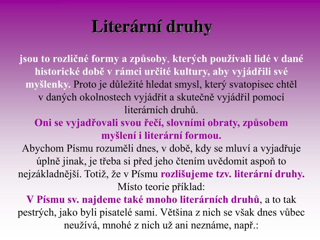 Literární druhy jsou to rozličné formy a způsoby, kterých používali lidé v dané historické době v rámci určité kultury, aby vyjádřili své myšlenky. Proto je důležité hledat smysl, který svatopisec chtěl v daných okolnostech vyjádřit a skutečně vyjádřil pomocí literárních druhů.Oni se vyjadřovali svou řečí, slovními obraty, způsobem myšlení i literární formou.Abychom Písmu rozuměli dnes, v době, kdy se mluví a vyjadřuje úplně jinak, je třeba si před jeho čtením uvědomit aspoň to nejzákladnější. Totiž, že v Písmu rozlišujeme tzv. literární druhy. Místo teorie příklad:V Písmu sv. najdeme také mnoho literárních druhů, a to tak pestrých, jako byli pisatelé sami. Většina z nich se však dnes vůbec neužívá, mnohé z nich už ani neznáme, např.: