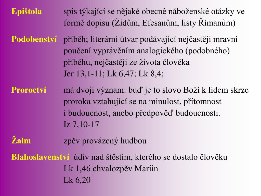 Epištola spis týkající se nějaké obecné náboženské otázky ve formě dopisu (Židům, Efesanům, listy Římanům)Podobenství příběh; literární útvar podávající nejčastěji mravní poučení vyprávěním analogického (podobného) příběhu, nejčastěji ze života člověka Jer 13,1-11; Lk 6,47; Lk 8,4;Proroctví má dvojí význam: buď je to slovo Boží k lidem skrze proroka vztahující se na minulost, přítomnost i budoucnost, anebo předpověď budoucnosti. Iz 7,10-17Žalm zpěv provázený hudbouBlahoslavenství údiv nad štěstím, kterého se dostalo člověku Lk 1,46 chvalozpěv Mariin Lk 6,20