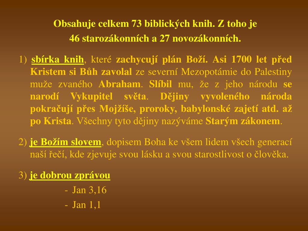 Obsahuje celkem 73 biblických knih. Z toho je 46 starozákonních a 27 novozákonních. 1) sbírka knih, které zachycují plán Boží. Asi 1700 let před Kristem si Bůh zavolal ze severní Mezopotámie do Palestiny muže zvaného Abraham. Slíbil mu, že z jeho národu se narodí Vykupitel světa. Dějiny vyvoleného národa pokračují přes Mojžíše, proroky, babylonské zajetí atd. až po Krista. Všechny tyto dějiny nazýváme Starým zákonem. 2) je Božím slovem, dopisem Boha ke všem lidem všech generací naší řečí, kde zjevuje svou lásku a svou starostlivost o člověka. 3) je dobrou zprávou • Jan 3,16 • Jan 1,1