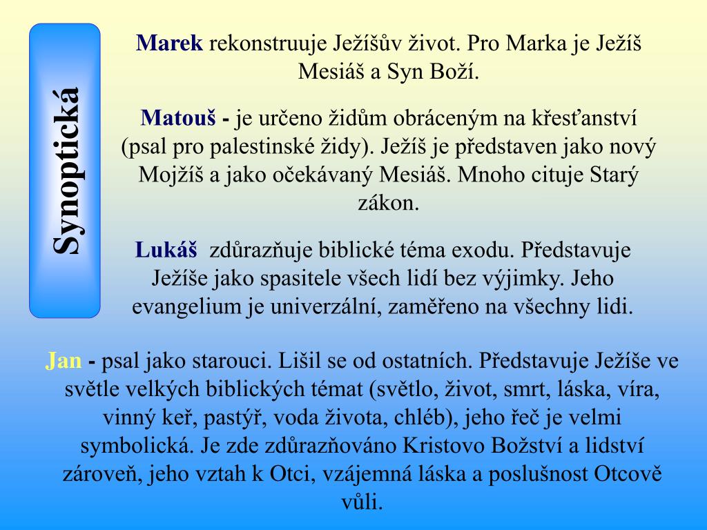Marekrekonstruuje Ježíšův život. Pro Marka je Ježíš Mesiáš a Syn Boží. Lukášzdůrazňuje biblické téma exodu. Představuje Ježíše jako spasitele všech lidí bez výjimky. Jeho evangelium je univerzální, zaměřeno na všechny lidi. Matouš - jeurčeno židům obráceným na křesťanství (psal pro palestinské židy). Ježíš je představen jako nový Mojžíš a jako očekávaný Mesiáš. Mnoho cituje Starý zákon. Synoptická Jan - psal jako starouci. Lišil se od ostatních. Představuje Ježíše ve světle velkých biblických témat (světlo, život, smrt, láska, víra, vinný keř, pastýř, voda života, chléb), jeho řeč je velmi symbolická. Je zde zdůrazňováno Kristovo Božství a lidství zároveň, jeho vztah k Otci, vzájemná láska a poslušnost Otcově vůli.