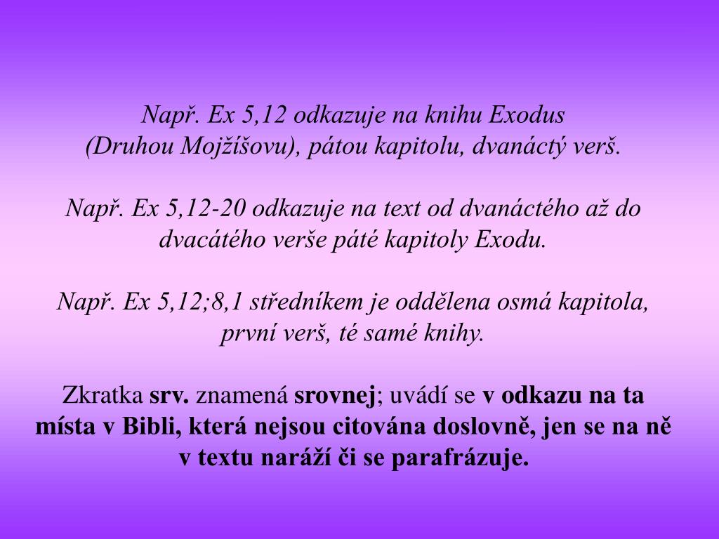 Např. Ex 5,12 odkazuje na knihu Exodus (Druhou Mojžíšovu), pátou kapitolu, dvanáctý verš.Např. Ex 5,12-20 odkazuje na text od dvanáctého až do dvacátého verše páté kapitoly Exodu.Např. Ex 5,12;8,1 středníkem je oddělena osmá kapitola, první verš, té samé knihy.Zkratka srv. znamená srovnej; uvádí se v odkazu na ta místa v Bibli, která nejsou citována doslovně, jen se na ně v textu naráží či se parafrázuje.