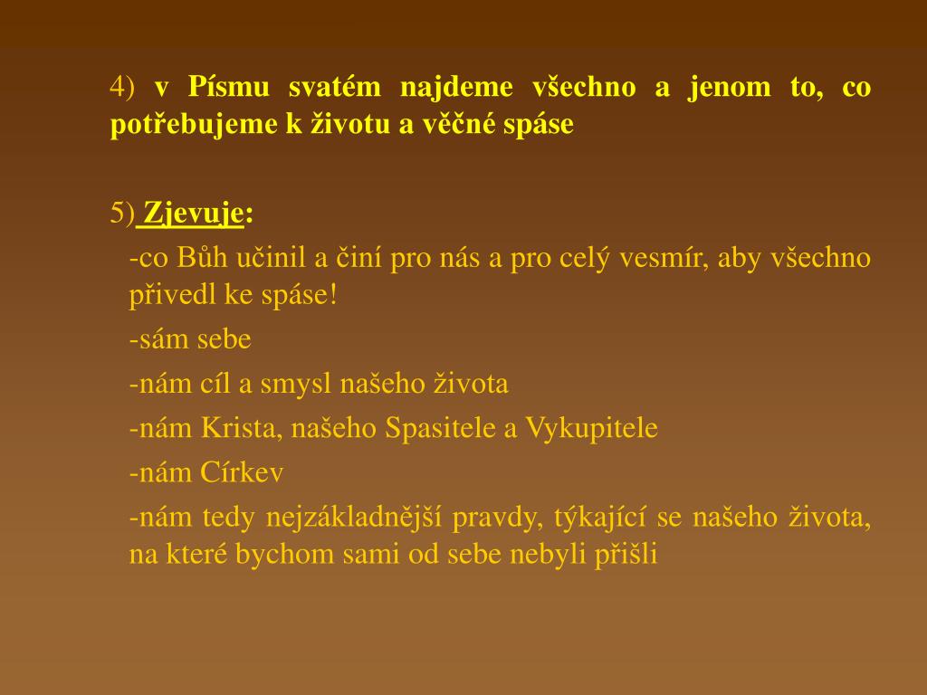 4)v Písmu svatém najdeme všechno a jenom to, co potřebujeme k životu a věčné spáse 5) Zjevuje: co Bůh učinil a činí pro nás a pro celý vesmír, aby všechno přivedl ke spáse! sám sebe nám cíl a smysl našeho života nám Krista, našeho Spasitele a Vykupitele nám Církev nám tedy nejzákladnější pravdy, týkající se našeho života, na které bychom sami od sebe nebyli přišli