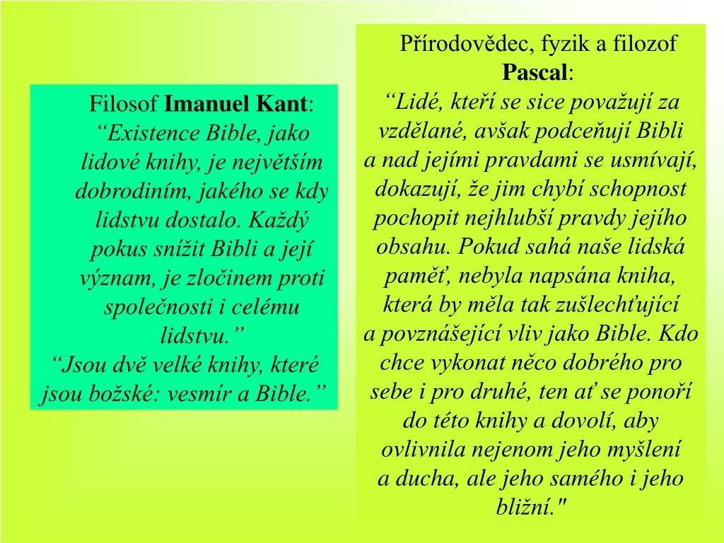 Přírodovědec, fyzik a filozof Pascal: • “Lidé, kteří se sice považují za vzdělané, avšak podceňují Bibli a nad jejími pravdami se usmívají, dokazují, že jim chybí schopnost pochopit nejhlubší pravdy jejího obsahu. Pokud sahá naše lidská paměť, nebyla napsána kniha, která by měla tak zušlechťující a povznášející vliv jako Bible. Kdo chce vykonat něco dobrého pro sebe i pro druhé, ten ať se ponoří do této knihy a dovolí, aby ovlivnila nejenom jeho myšlení a ducha, ale jeho samého i jeho bližní." • Filosof Imanuel Kant: • “Existence Bible, jako lidové knihy, je největším dobrodiním, jakého se kdy lidstvu dostalo. Každý pokus snížit Bibli a její význam, je zločinem proti společnosti i celému lidstvu.” • “Jsou dvě velké knihy, které jsou božské: vesmír a Bible.”