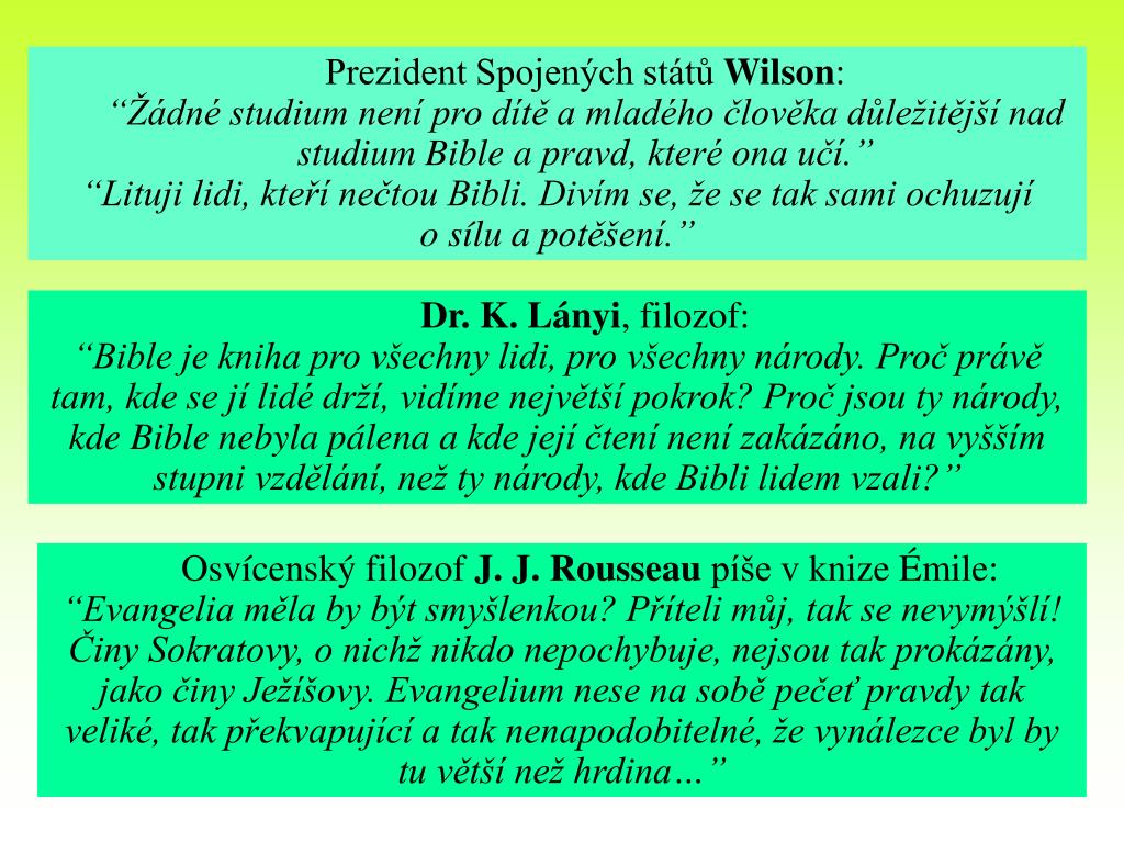 Prezident Spojených států Wilson: • “Žádné studium není pro dítě a mladého člověka důležitější nad studium Bible a pravd, které ona učí.” • “Lituji lidi, kteří nečtou Bibli. Divím se, že se tak sami ochuzují o sílu a potěšení.” • Dr. K. Lányi, filozof: • “Bible je kniha pro všechny lidi, pro všechny národy. Proč právě tam, kde se jí lidé drží, vidíme největší pokrok? Proč jsou ty národy, kde Bible nebyla pálena a kde její čtení není zakázáno, na vyšším stupni vzdělání, než ty národy, kde Bibli lidem vzali?” • Osvícenský filozof J. J. Rousseau píše v knize Émile: • “Evangelia měla by být smyšlenkou? Příteli můj, tak se nevymýšlí! Činy Sokratovy, o nichž nikdo nepochybuje, nejsou tak prokázány, jako činy Ježíšovy. Evangelium nese na sobě pečeť pravdy tak veliké, tak překvapující a tak nenapodobitelné, že vynálezce byl by tu větší než hrdina…”