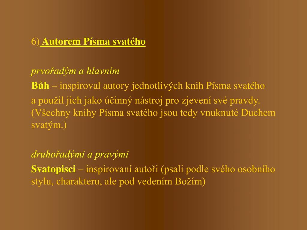 6) Autorem Písma svatého prvořadým a hlavním Bůh– inspiroval autory jednotlivých knih Písma svatého a použil jich jako účinný nástroj pro zjevení své pravdy. (Všechny knihy Písma svatého jsou tedy vnuknuté Duchem svatým.) druhořadými a pravými Svatopisci– inspirovaní autoři (psali podle svého osobního stylu, charakteru, ale pod vedením Božím)