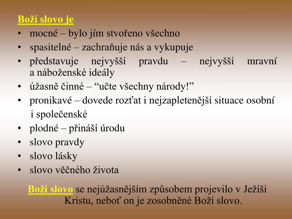 Boží slovo je mocné – bylo jím stvořeno všechno spasitelné – zachraňuje nás a vykupuje představuje nejvyšší pravdu – nejvyšší mravní a náboženské ideály úžasně činné – “učte všechny národy!” pronikavé – dovede rozťat i nejzapletenější situace osobní i společenské plodné – přináší úrodu slovo pravdy slovo lásky slovo věčného života Boží slovo se nejúžasnějším způsobem projevilo v Ježíši Kristu, neboť on je zosobněné Boží slovo.