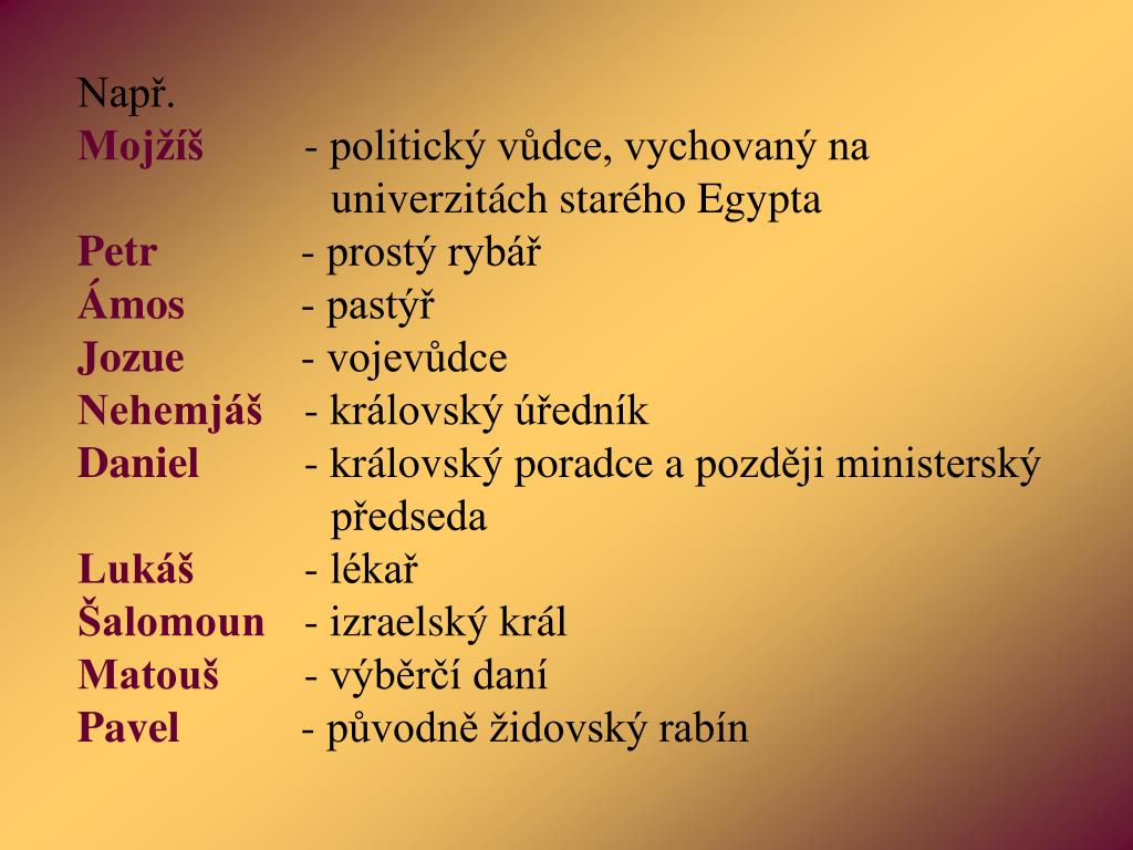 Např.Mojžíš - politický vůdce, vychovaný na univerzitách starého EgyptaPetr - prostý rybářÁmos - pastýřJozue - vojevůdceNehemjáš - královský úředníkDaniel - královský poradce a později ministerský předsedaLukáš - lékařŠalomoun - izraelský králMatouš - výběrčí daníPavel - původně židovský rabín