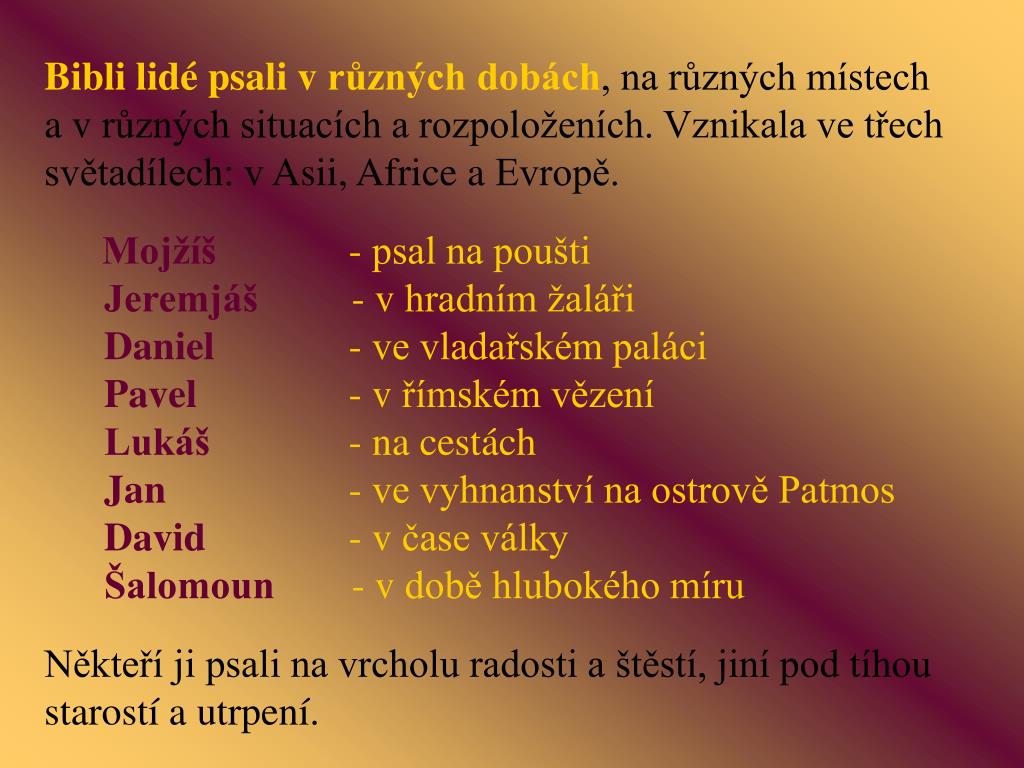 Bibli lidé psali v různých dobách, na různých místech a v různých situacích a rozpoloženích. Vznikala ve třech světadílech: v Asii, Africe a Evropě.Mojžíš- psal na pouštiJeremjáš- v hradním žalářiDaniel- ve vladařském paláciPavel- v římském vězeníLukáš- na cestáchJan- ve vyhnanství na ostrově PatmosDavid- v čase válkyŠalomoun- v době hlubokého míruNěkteří ji psali na vrcholu radosti a štěstí, jiní pod tíhou starostí a utrpení.