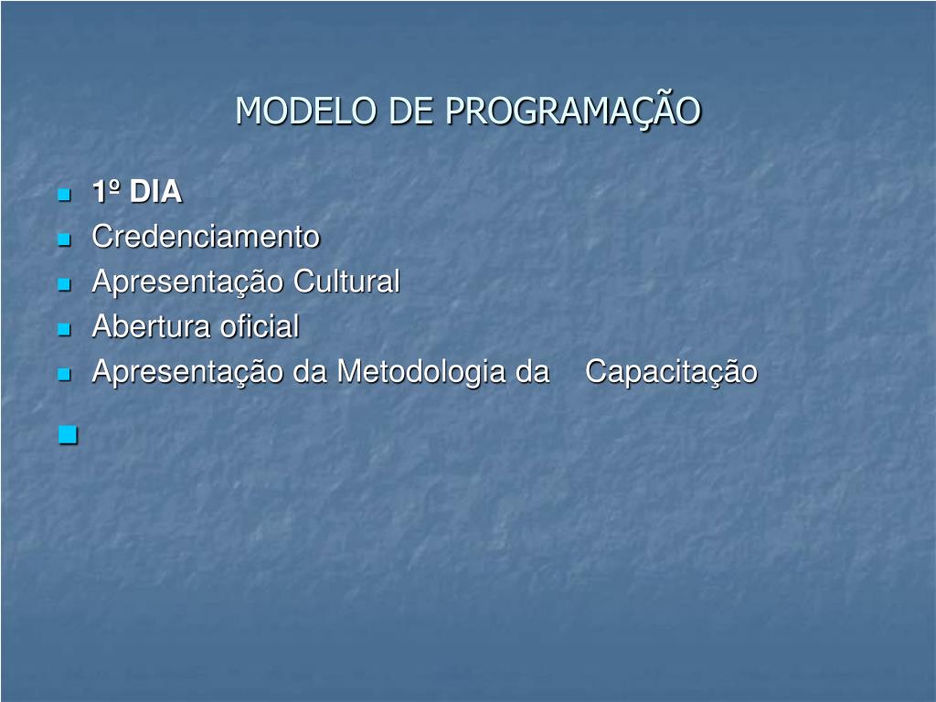 MODELO DE PROGRAMAÇÃO • 1º DIA • Credenciamento • Apresentação Cultural • Abertura oficial • Apresentação da Metodologia da Capacitação
