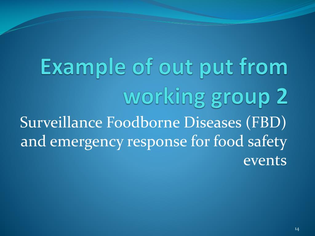 Example of out put from working group 2 Surveillance Foodborne Diseases (FBD) and emergency response for food safety events