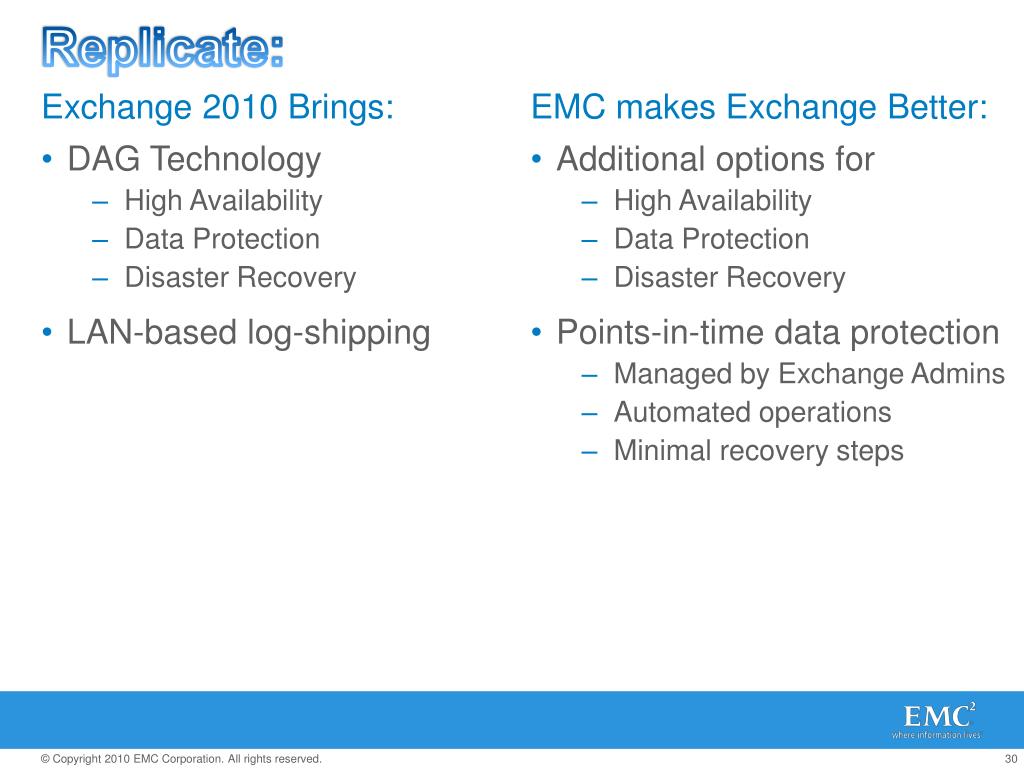 Replicate: Exchange 2010 Brings: EMC makes Exchange Better: Additional options for High Availability Data Protection Disaster Recovery Points-in-time data protection Managed by Exchange Admins Automated operations Minimal recovery steps • DAG Technology • High Availability • Data Protection • Disaster Recovery • LAN-based log-shipping