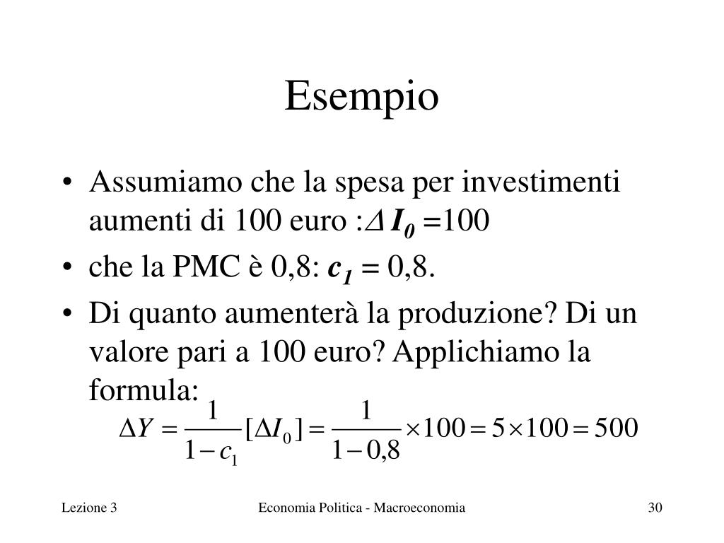 Esempio • Assumiamo che la spesa per investimenti aumenti di 100 euro : I0 =100 • che la PMC è 0,8: c1= 0,8. • Di quanto aumenterà la produzione? Di un valore pari a 100 euro? Applichiamo la formula: Economia Politica - Macroeconomia
