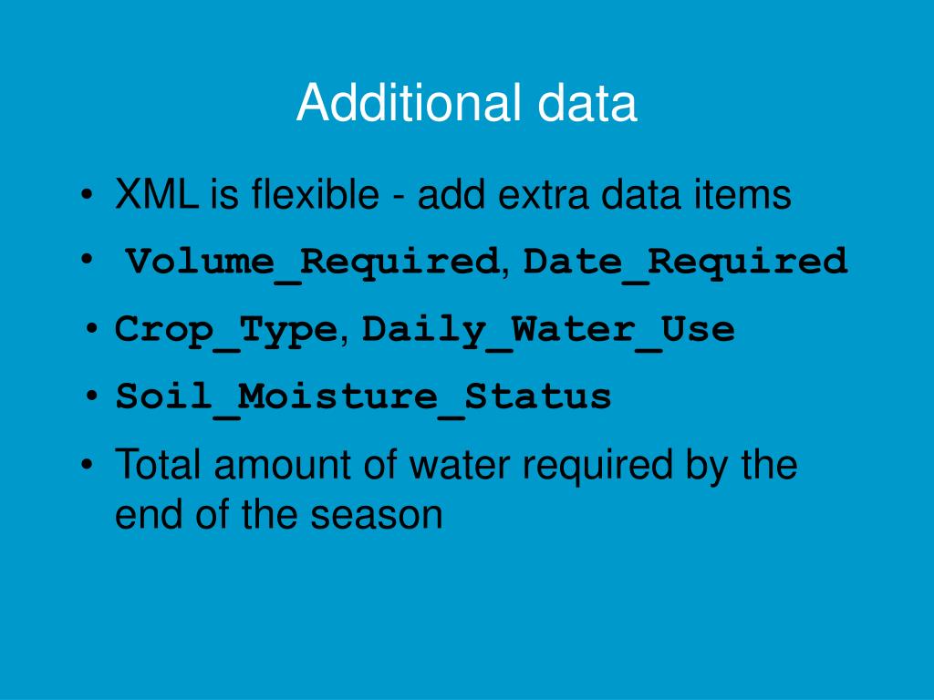 Additional data • XML is flexible - add extra data items • Volume_Required, Date_Required • Crop_Type, Daily_Water_Use • Soil_Moisture_Status • Total amount of water required by the end of the season
