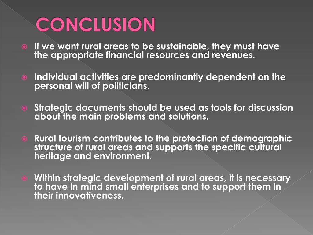 CONCLUSION • If we want rural areas to be sustainable, they must have the appropriate financial resources and revenues. • Individual activities are predominantly dependent on the personal will of politicians. • Strategic documents should be used as tools for discussion about the main problems and solutions. • Rural tourism contributes to the protection of demographic structure of rural areas and supports the specific cultural heritage and environment. • Within strategic development of rural areas, it is necessary to have in mind small enterprises and to support them in their innovativeness.
