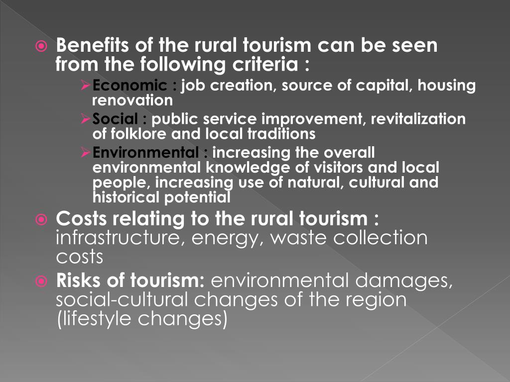 Benefits of the rural tourism can be seen from the following criteria : • Economic : job creation, source of capital, housing renovation • Social : public service improvement, revitalization of folklore and local traditions • Environmental : increasing the overall environmental knowledge of visitors and local people, increasing use of natural, cultural and historical potential • Costs relating to the rural tourism :infrastructure, energy, waste collection costs • Risks of tourism:environmental damages, social-cultural changes of the region (lifestyle changes)