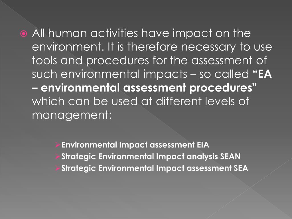 All human activities have impact on the environment. It is therefore necessary to use tools and procedures for the assessment of such environmental impacts – so called “EA – environmental assessment procedures" which can be used at different levels of management: • Environmental Impact assessment EIA • Strategic Environmental Impact analysis SEAN • Strategic Environmental Impact assessment SEA