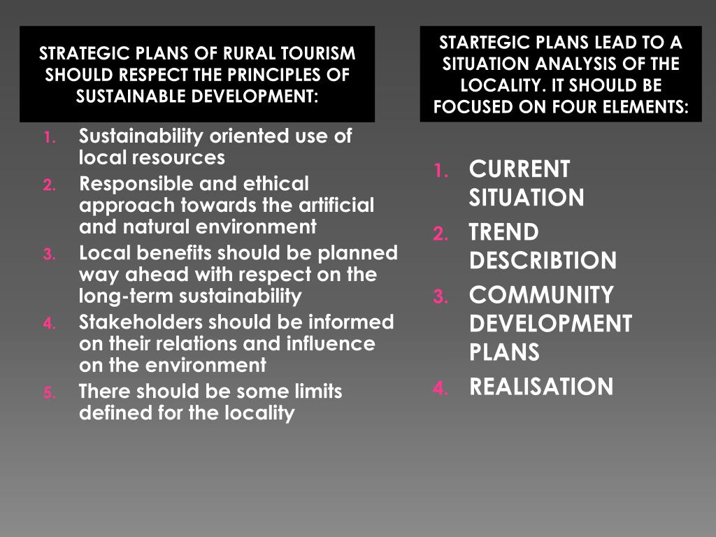STRATEGIC PLANS OF RURAL TOURISM SHOULD RESPECT THE PRINCIPLES OF SUSTAINABLE DEVELOPMENT: • Sustainability oriented use of local resources • Responsible and ethical approach towards the artificial and natural environment • Local benefits should be planned way ahead with respect on the long-term sustainability • Stakeholdersshould be informed on their relations and influence on the environment • There should be some limits defined for the locality • CURRENT SITUATION • TREND DESCRIBTION • COMMUNITY DEVELOPMENT PLANS • REALISATION STARTEGIC PLANS LEAD TO A SITUATION ANALYSIS OF THE LOCALITY. IT SHOULD BE FOCUSED ON FOUR ELEMENTS: