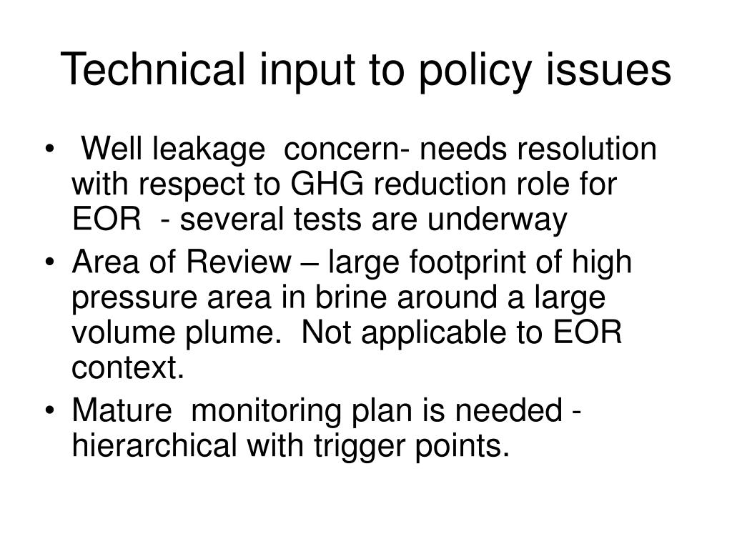 Technical input to policy issues • Well leakage concern- needs resolution with respect to GHG reduction role for EOR - several tests are underway • Area of Review – large footprint of high pressure area in brine around a large volume plume. Not applicable to EOR context. • Mature monitoring plan is needed - hierarchical with trigger points.
