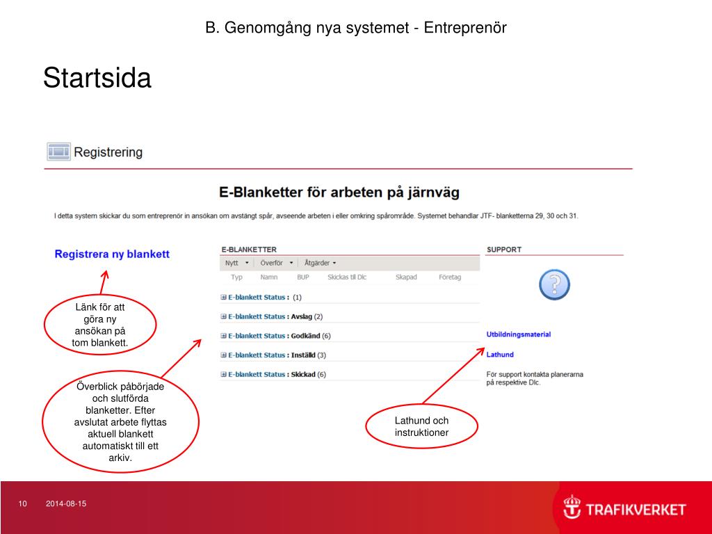 B. Genomgång nya systemet - Entreprenör Komma in i systemet 1. Logga in på www.trafikverket.se med ditt användarnamn och lösenord. * 2. Klicka på ”E-Blanketter” Klicka på ”E- blanketter” och du är redo att börja fylla i dina ansökningar Här ansöker du på blankett 29-31. * = Entreprenör behöver ansöka om behörighet hos Trafikverket och erhåller då dessa användaruppgifter.