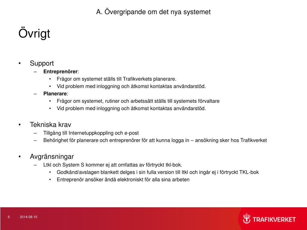 A. Övergripande om det nya systemet Övrigt • Support • Entreprenörer: • Frågor om systemet ställs till Trafikverkets planerare. • Vid problem med inloggning och åtkomst kontaktas användarstöd. • Planerare: • Frågor om systemet, rutiner och arbetssätt ställs till systemets förvaltare • Vid problem med inloggning och åtkomst kontaktas användarstöd. • Tekniska krav • Tillgång till Internetuppkoppling och e-post • Behörighet för planerare och entreprenörer för att kunna logga in – ansökning sker hos Trafikverket • Avgränsningar • Ltkl och System S kommer ej att omfattas av förtryckt tkl-bok. • Godkänd/avslagen blankett delges i sin fulla version till ltkl och ingår ej i förtryckt TKL-bok • Entreprenör ansöker ändå elektroniskt för alla sina arbeten