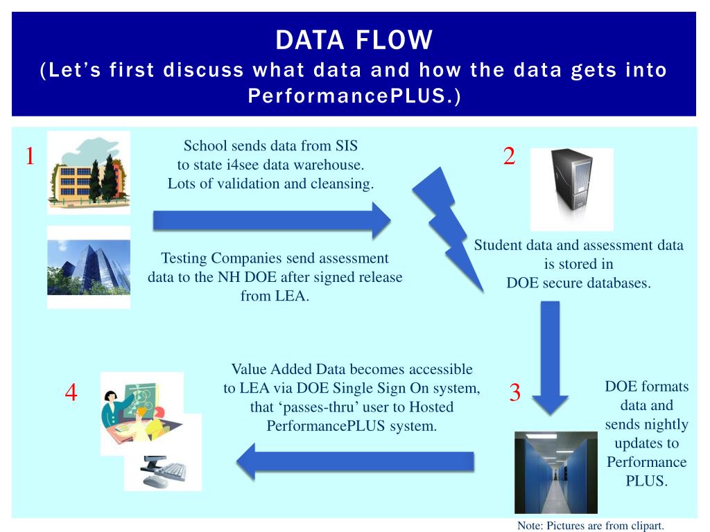 Data Flow(Let’s first discuss what data and how the data gets into PerformancePLUS.) School sends data from SIS to state i4see data warehouse. Lots of validation and cleansing. 1 2 Student data and assessment data is stored in DOE secure databases. Testing Companies send assessment data to the NH DOE after signed release from LEA. Value Added Data becomes accessible to LEA via DOE Single Sign On system, that ‘passes-thru’ user to Hosted PerformancePLUS system. 4 3 DOE formats data and sends nightly updates to PerformancePLUS. • Note: Pictures are from clipart.