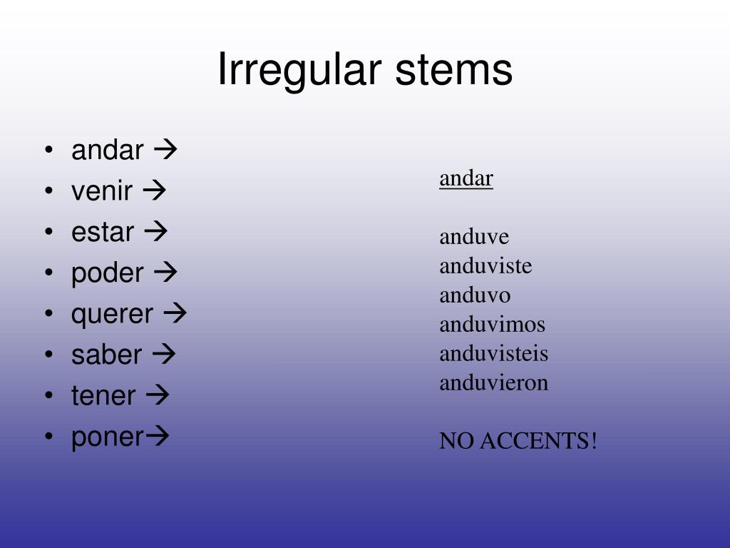 Irregular stems • andar • venir • estar • poder • querer • saber • tener • poner andar anduve anduviste anduvo anduvimos anduvisteis anduvieron NO ACCENTS!