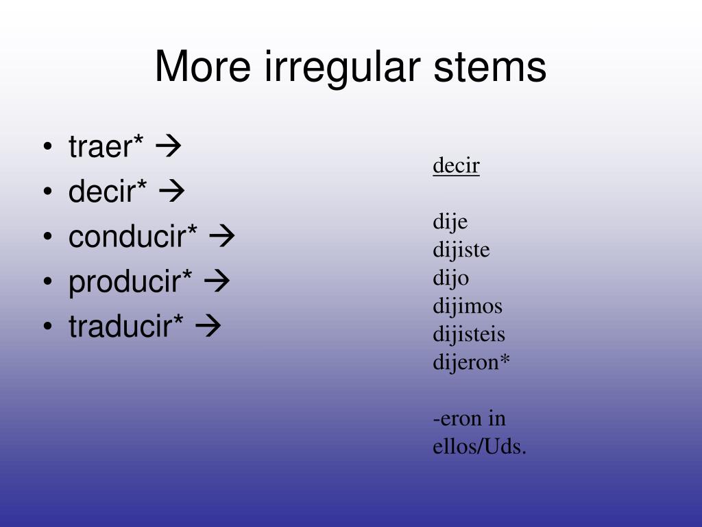 More irregular stems • traer* • decir* • conducir* • producir* • traducir* decir dije dijiste dijo dijimos dijisteis dijeron* -eron in ellos/Uds.