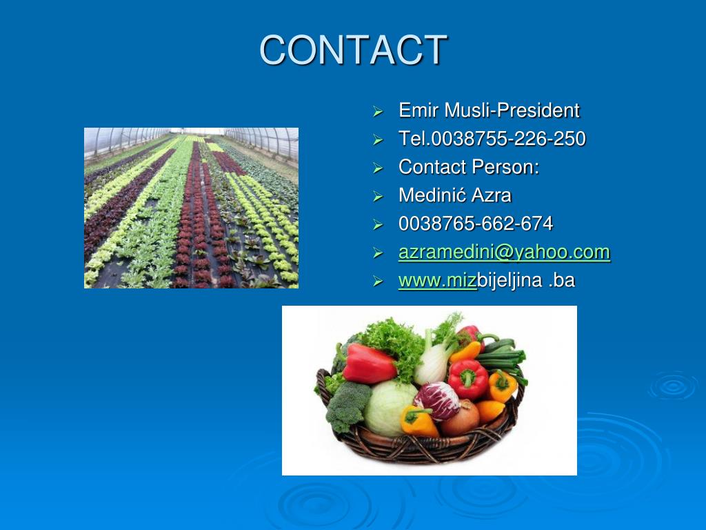 CONTACT Emir Musli-President Tel.0038755-226-250 Contact Person: Medinić Azra 0038765-662-674 azramedini@yahoo.com www.mizbijeljina .ba