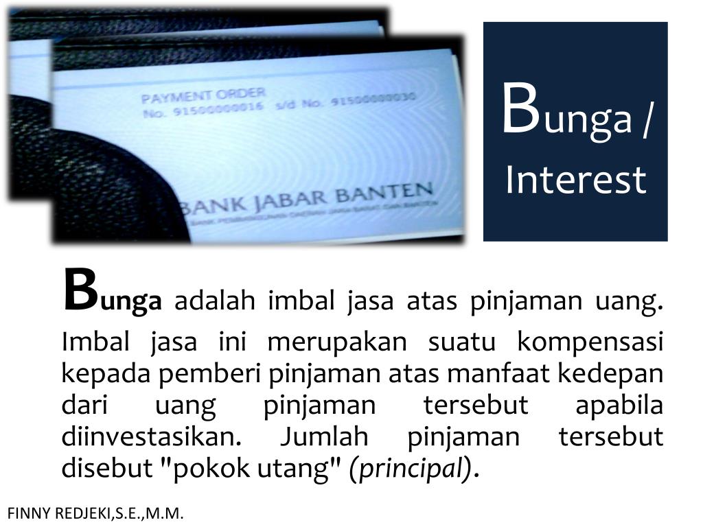 Bunga / Interest Bunga adalah imbal jasa atas pinjaman uang. Imbal jasa ini merupakan suatu kompensasi kepada pemberi pinjaman atas manfaat kedepan dari uang pinjaman tersebut apabila diinvestasikan. Jumlah pinjaman tersebut disebut "pokok utang" (principal). FINNY REDJEKI,S.E.,M.M.